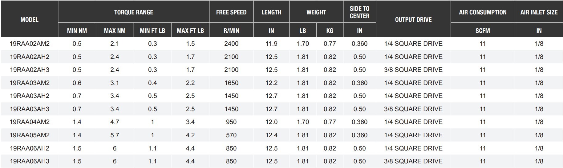 Type: Nutrunner | Drive Size (in.): 1/4 | Drive Type: Square | Torque Range (ft-lbs): 0.3 - 1.5 | Torque Range (Nm): 0.5 - 2.1 | Free Speed (RPM): 2400 | Length (in.): 11.9 | Side to Center (in.): 0.360 | Air Inlet NPT (in.): 1/8 | Air Consumption (SCFM): 11