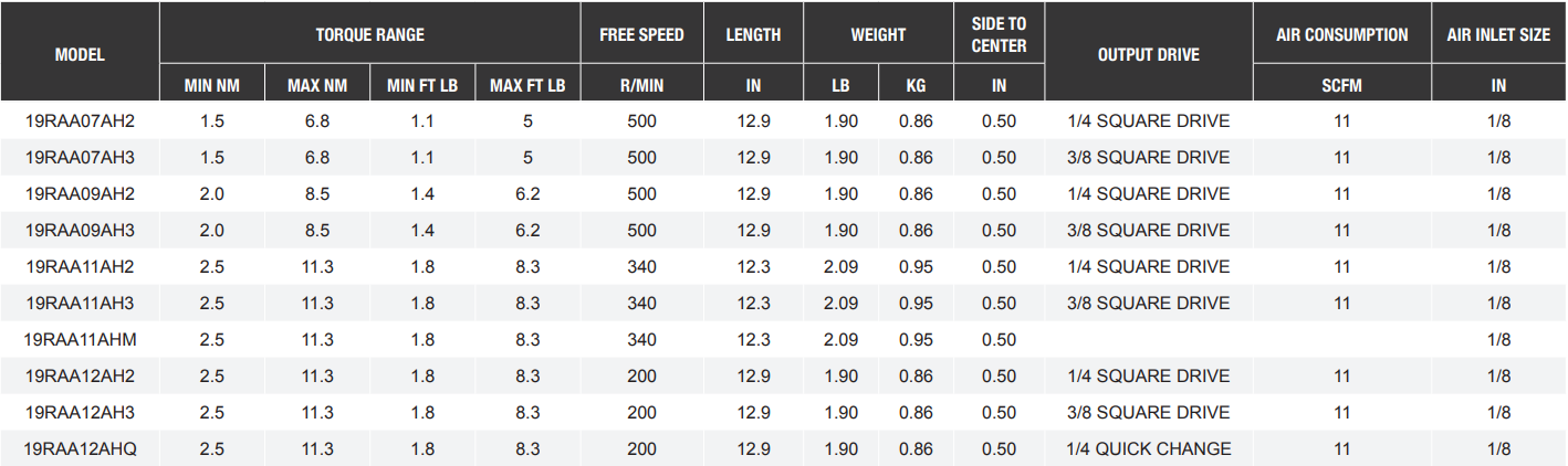 Type: Nutrunner | Drive Size (in.): 3/8 | Drive Type: Square Drive | Torque Range: 1.1-5ft-lbs/1.5-6.8Nm | Free Speed (RPM): 500 | Length: 12.9”/326mm | Side to Center (in.): 0.50 | Air Inlet NPT (in.): 1/8 | Air Consumption (SCFM): 11 | Min Hose I.D (in.): 1/4