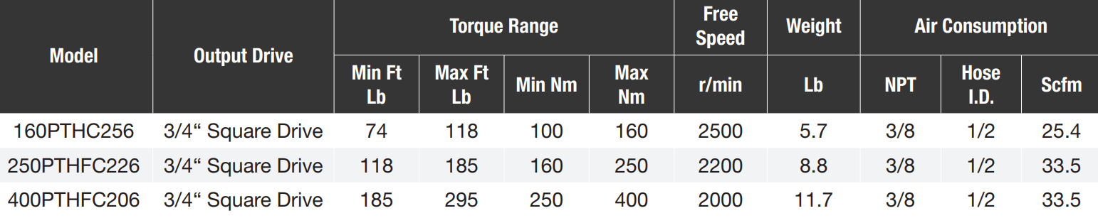Type: Pulse Tool | Series: C Series | Grip Type: Pistol | Drive Size (in.): 3/4 | Drive Type: Square Drive | Free Speed (RPM): 2200 | Torque Range (ft-lbs): 118 - 185 | Torque Range (Nm): 160 - 250 | Air Inlet Size (in.): 3/8 | Minimum Hose I.D (in.): 1/2 | Air Consumption (SCFM): 33.5