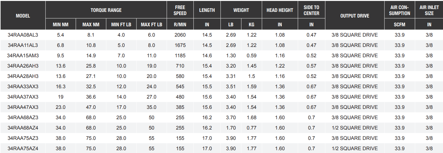 Type: Nutrunner | Drive Size (in.): 3/8 | Drive Type: Square Drive | Torque Range: 4-6ft-lbs / 5.4-8.1Nm | Free Speed (RPM): 2,060 | Length: 14.5" / 368mm | Head Height: 1.08" / 27.43mm | Side to Center: 0.47" / 12.0mm | Air Inlet NPT (in.): 3/8 | Min. Hose I.D (in.): 1/2 | Air Consumption (SCFM): 33.9
