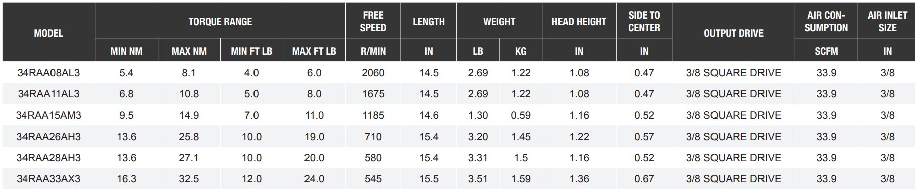 Type: Nutrunner | Drive Size (in.): 3/8 | Drive Type: Square | Torque Range (ft-lbs): 5 - 8 | Torque Range (Nm): 6.8 - 10.8 | Free Speed (RPM): 1675 | Length (in.): 14.5 | Head Height (in.): 1.08 | Side to Center (in.): 0.47 | Air Inlet Size (in.): 3/8 | Air Consumption (SCFM): 33.9