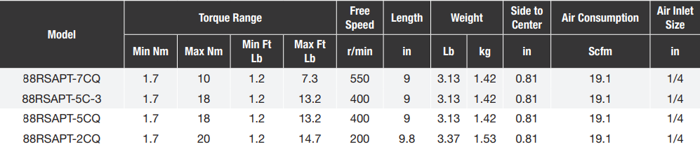Type: Screwdriver | Drive Size (in.): 1/4 | Drive Type: Hex Quick Change | Torque Range (ft-lbs): 1.2 - 13.2 | Free Speed (RPM): 400 | Length (in.): 9 | Side to Centre (in.): 0.81 | Air Inlet NPT (in.): 1/4 | Air Consumption (SCFM): 19.1