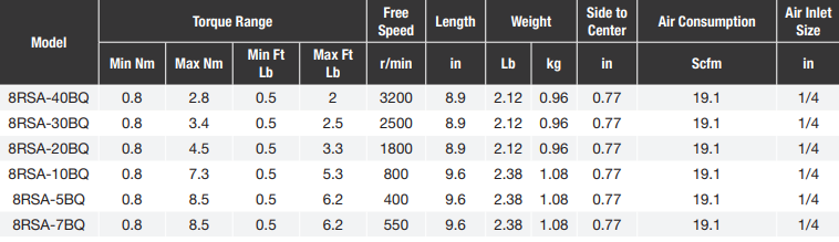 Type: Screwdriver | Free Speed (RPM): 1,800 | Torque Range (ft-lbs): 0.5 - 3.3 | Torque Range (Nm): 0.8 - 4.5 | Length (in.): 8.9 | Side to Center (in.): 0.77 | Air Consumption (SCFM): 19.1 | Air Inlet Size (in.): 1/4