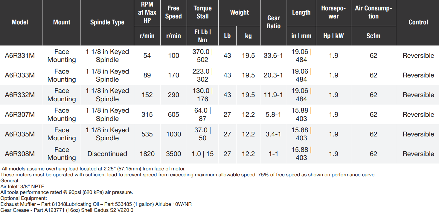 Type: Air Motor | Series: A6 Series | Spindle Type: Keyed | Spindle (in.): 1-1/8 | RPM: 100 | Stall Torque (ft-lbs): 370 | Gear Ratio: 33.6-1 | Air Consumption (SCFM): 62 | Control: Reversible | Exhaust: Rear | Power (HP): 1.9 | Motor Configuration: Axial Piston | Mount: Face Mounting