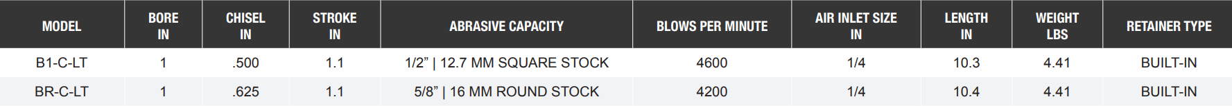 Type: Chisel Scaler | Bore (in.): 1 | Chisel (in.): 0.5 | Stroke (in.): 1.1 | Abrasive Capacity (in.): 1/2 Square Stock | Blows Per Minute: 4,600 | Length (in.): 10.3 | Air Inlet Size (in.): 1/4 | Retainer Type: Built-in