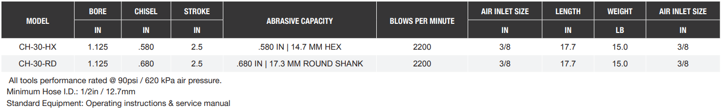 Type: Chipping Hammer | Bore (in.): 1.125 | Chisel (in.): 0.580 | Abrasive Capacity (in.): 0.580 Hex. | Stroke (in.): 2.5 | Housing Type: Aluminum | Blows Per Minute (BPM): 2,200 | Length (in.): 17.7 | Air Inlet Size (in.): 3/8