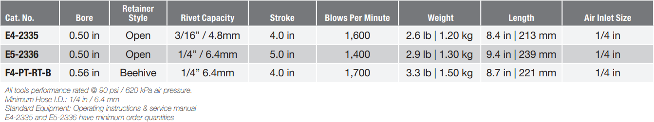 Type: Rivet Hammer | Retainer Type: Beehive | Bore (in.): 0.56 | Rivet Capacity (in.): 1/4 | Stroke (in.): 4 | Housing Type: Aluminum | Blows Per Minute (BPM): 1700 | Length: 8.7” / 221mm | Air Inlet Size (in.): 1/4