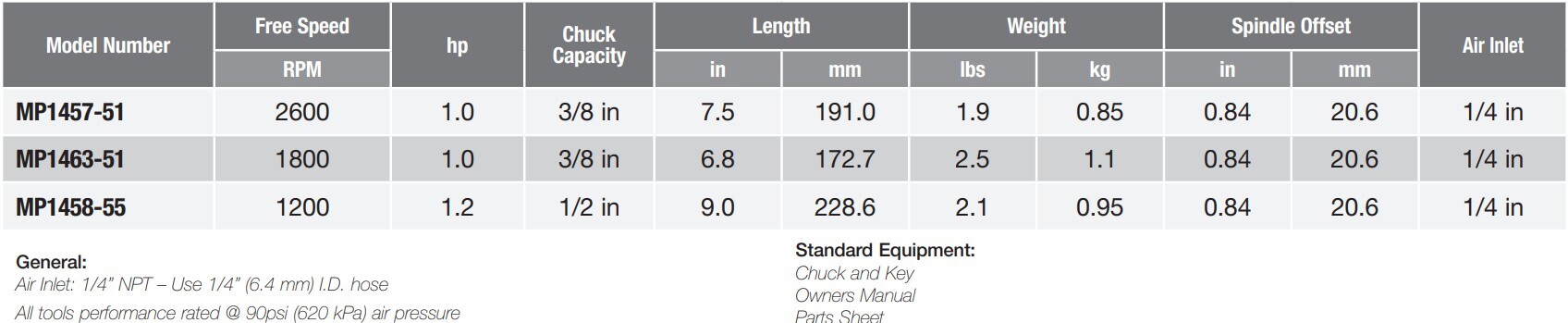 Type: Drill | Free Speed (RPM): 1,800 | Power (HP): 1.0 | Chuck Capacity (in.): 3/8 | Length (in.): 6.8 | Spindle Offset (in.): 0.84 | Air Inlet NPT (in.): 1/4