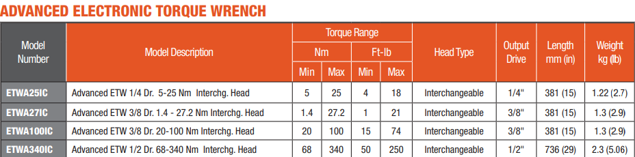 Type: Advanced Electronic Torque Wrench | Min Torque Range (ft-lbs): 15 | Max Torque Range (ft-lbs): 74 | Length (in.): 15 | Head Type: Interchangeable | Output Drive (in.): 3/8