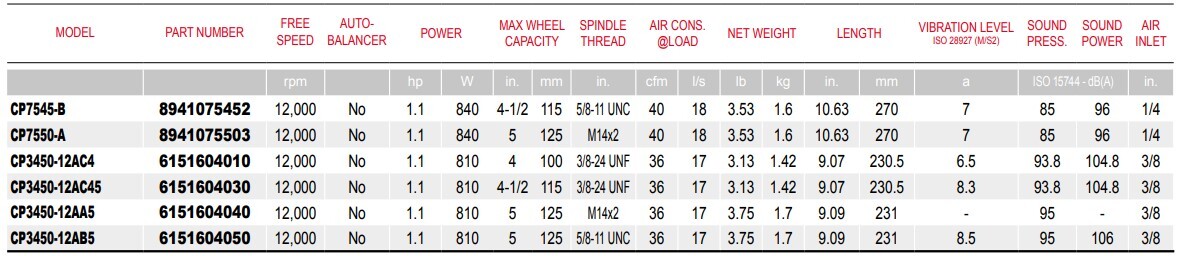 Type: Angle Wheel Grinder | Free Speed (RPM): 12000 | Length (in.): 9.09 | Length (mm): 231 | Air Consumption @ Load (CFM): 36 | Air Consumption @ Load (l/s): 17 | Vibration Level (a): 8.5 | Sound Pressure (dbA): 95 | Sound Power (dbA): 106 | Air Inlet Size (in.): 3/8 | Power (HP): 1.1 | Power (W): 810 | Spindle Thread (in.): 5/8-11 UNC | Max Wheel Capacity (in.): 5 | Max Wheel Capacity (mm): 125 | Min Hose Size (in.): 3/8 | Min Hose Size (mm): 10 | Auto Balancer: No