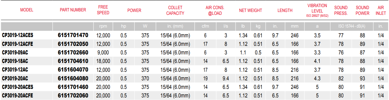 Type: Die Grinder | Free Speed (RPM): 20000 | Length (in.): 8.5 | Length (mm): 216 | Air Consumption @ Load (CFM): 19 | Air Consumption @ Load (l/s): 9.4 | Vibration Level (a): 4.3 | Sound Pressure (dbA): 82 | Sound Power (dbA): 93 | Air Inlet Size (in.): 1/4 | Power (HP): 0.5 | Power (W): 370 | Collet Capacity (in.): 15/64 | Collet Capacity (mm): 6 | Min Hose Size (in.): 3/8 | Min Hose Size (mm): 10
