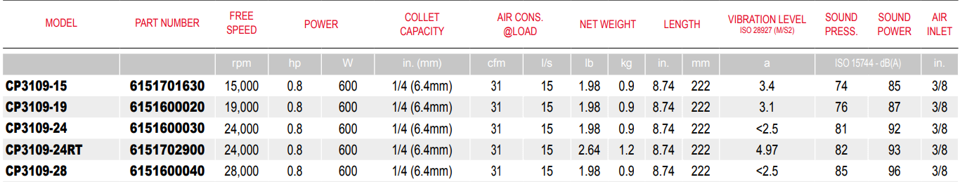 Type: Die Grinder | Free Speed (RPM): 28000 | Length (in.): 8.74 | Length (mm): 222 | Air Consumption @ Load (CFM): 31 | Air Consumption @ Load (l/s): 15 | Vibration Level (a): <2.5 | Sound Pressure (dbA): 85 | Sound Power (dbA): 96 | Air Inlet Size (in.): 3/8 | Power (HP): 0.8 | Power (W): 600 | Collet Capacity (in.): 1/4 | Collet Capacity (mm): 6.4 | Min Hose Size (in.): 3/8 | Min Hose Size (mm): 10