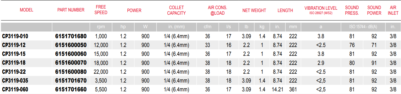 Type: Die Grinder | Free Speed (RPM): 22000 | Length (in.): 8.74 | Length (mm): 222 | Air Consumption @ Load (CFM): 38 | Air Consumption @ Load (l/s): 18 | Vibration Level (a): <2.5 | Sound Pressure (dbA): 81 | Sound Power (dbA): 92 | Air Inlet Size (in.): 3/8 | Power (HP): 1.2 | Power (W): 900 | Collet Capacity (in.): 1/4 | Collet Capacity (mm): 6.4 | Min Hose Size (in.): 3/8 | Min Hose Size (mm): 10