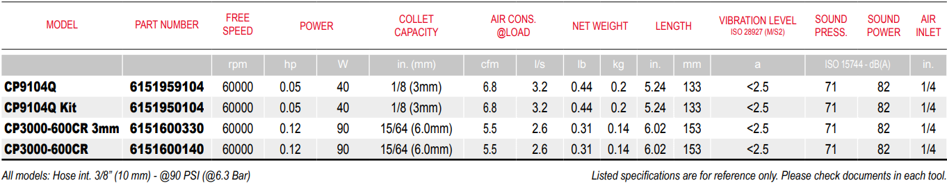 Type: Pencil Die Grinder | Free Speed (RPM): 60000 | Air Consumption @ Load (CFM): 6.8 | Air Consumption @ Load (l/s): 3.2 | Vibration Level (a): <2.5 | Sound Pressure (dbA): 71 | Sound Power (dbA): 82 | Air Inlet Size (in.): 1/4 | Power (HP): 0.05 | Power (W): 40 | Collet Capacity (in.): 1/8 | Collet Capacity (mm): 3 | Min Hose Size (in.): 3/8 | Min Hose Size (mm): 10