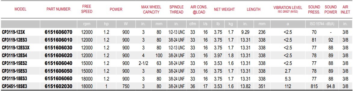 Type: Straight Wheel Grinder | Free Speed (RPM): 18000 | Length (in.): 13.31 | Length (mm): 338 | Air Consumption @ Load (CFM): 33 | Air Consumption @ Load (l/s): 16 | Vibration Level (a): 5.3 | Sound Pressure (dbA): 77 | Sound Power (dbA): 88 | Air Inlet Size (in.): 3/8 | Power (HP): 1.2 | Power (W): 900 | Spindle Thread (in.): 3/8-24 UNF | Max Wheel Capacity (in.): 3 | Max Wheel Capacity (mm): 80 | Min Hose Size (in.): 3/8 | Min Hose Size (mm): 10