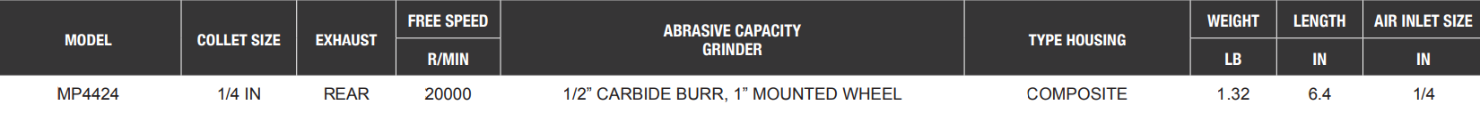 Type: Die Grinder | Collet Size (in.): 1/4 | Power (HP): 0.3 | Free Speed (RPM): 20,000 | Abrasive Capacity (in.): 1/2 Carbide Burr, 1 Mounted Wheel | Housing Type: Composite | Length (in.): 6.4 | Air Inlet Size (in.): 1/4 | Exhaust: Rear