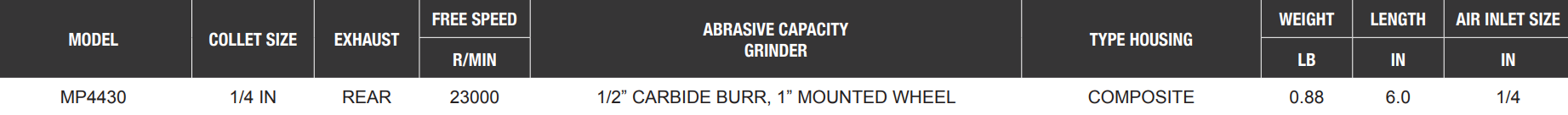 Type: Die Grinder | Collet Size (in.): 1/4 | Power (HP): 0.3 | Free Speed (RPM): 23,000 | Abrasive Capacity (in.): 1/2 Carbide Burr, 1 Mounted Wheel | Housing Type: Composite | Length (in.): 6 | Air Inlet Size (in.): 1/4 | Exhaust: Rear