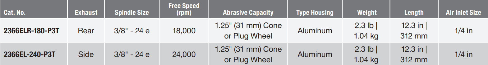 Type: Grinder | Exhaust: Side | Spindle Size (in.): 3/8 – 24 External | Free Speed (RPM): 24,000 | Abrasive Capacity (in.): 1.25 Cone or Plug Wheel | Housing: Aluminum | Length (in.): 12.3 | Air Inlet Size (in.): 1/4