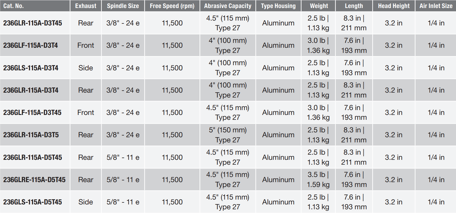 Type: Grinder | Exhaust Type: Rear | Spindle Size (in.): 3/8 - 24 External | Free Speed (RPM): 11,500 | Abrasive Capacity (in.): 4 Type 27 | Housing: Aluminum | Length (in.): 8.3 | Head Height (in.): 3.2 | Air Inlet Size (in.): 1/4