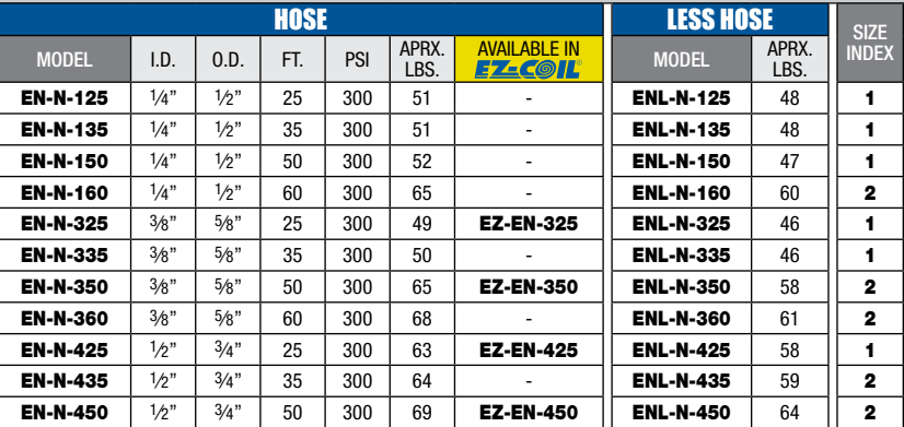 Type: Spring Rewind Enclosed Hose Reel | Series: EN Series | Hose I.D (in.): 1/2 | Hose O.D (in.): 3/4 | Hose Length (ft.): 50 | Hose Included: No | Max PSI: 300 | Width (in.): 8.5 | Height (in.): 21.75 | Length (in.): 21.88 | Mounting Pattern (in.): 4M | Mounting Pattern (in.): 5N | Base (in.): 6X | Base (in.): 6Y