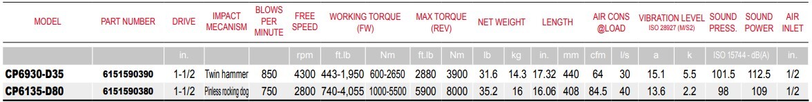 Type: Impact Wrench | Drive Size (in.): 1-1/2 | Impact Mecanism: Pinless rocking dog | Blows Per Minute (BPM): 750 | Free Speed (RPM): 2800 | Working Torque Range (ft-lbs): 740-4,055 | Working Torque Range (fwd) (Nm): 1000-5500 | Max Reverse Torque (ft-lbs): 5900 | Max Reverse Torque (Nm): 8000 | Length (in.): 16.06 | Length (mm): 408 | Air Consumption @ Load (CFM): 84.5 | Air Consumption @ Load (l/s): 40 | Vibration Level (a): 15.1 | Vibration Level (k): 2.2 | Sound Pressure (dbA): 101.5 | Sound Power (dbA): 112.5 | Air Inlet Size (in.): 1/2 | Min Hose Size (in.): 3/8 | Min Hose Size (mm): 10
