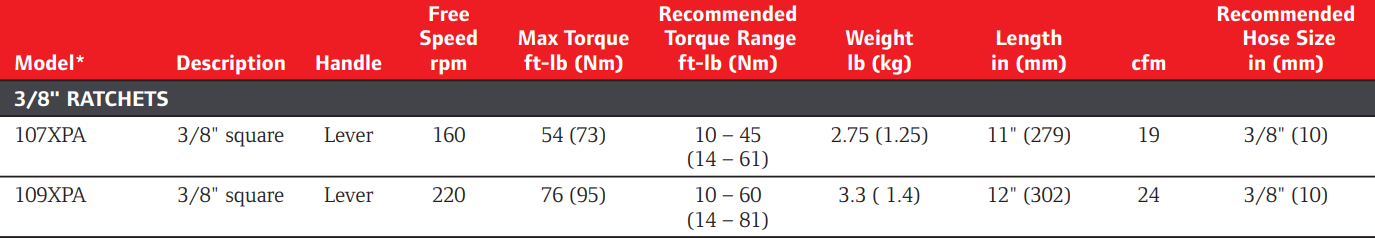 Type: Ratchet Wrench | Handle: Lever | Drive Size (in.): 3/8 | Drive Type: Square | Free Speed (RPM): 220 | Recomm. Torque Range (ft-lbs): 10 - 60 | Recomm. Torque Range (Nm): 14 - 81 | Max Torque (ft-lbs): 76 | Max Torque (Nm): 95 | Length (in.): 12 | Air Consumption (CFM): 24 | Air Inlet (in): 1/4 NPTF | Recomm. Hose Size (in.): 3/8