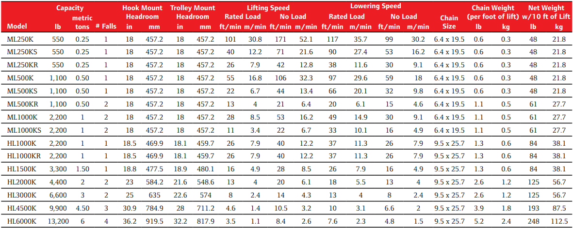 Ingersoll Rand ML250K-2C10-C6 MLK Series Air Chain Hoist is designed for demanding industrial applications, with lifting capacities ranging from 550 lbs (250 kg) to 2200 lbs (1000 kg). Proven in service for over 25 years, this hoist is recognized for its rugged construction, long service life, and reliable performance in high-production environments. Built on a common design with interchangeable parts, the ML250K MLK Series Air Chain Hoist helps simplify maintenance and minimize downtime. Its high lifting speed and precise load spotting make it ideal for fast, repetitive production cycle operations. For specialized applications, Spark-Resistant Configurations and slow-speed precision spotting models are also available. The MLK Series Air Chain Hoist is offered with a wide range of options and accessories to meet specific operational requirements. It comes standard with 10 ft of lift and a choice of 6 ft pendant control or 6 ft pull chain control, providing flexibility, safety, and ease of operation in industrial settings.