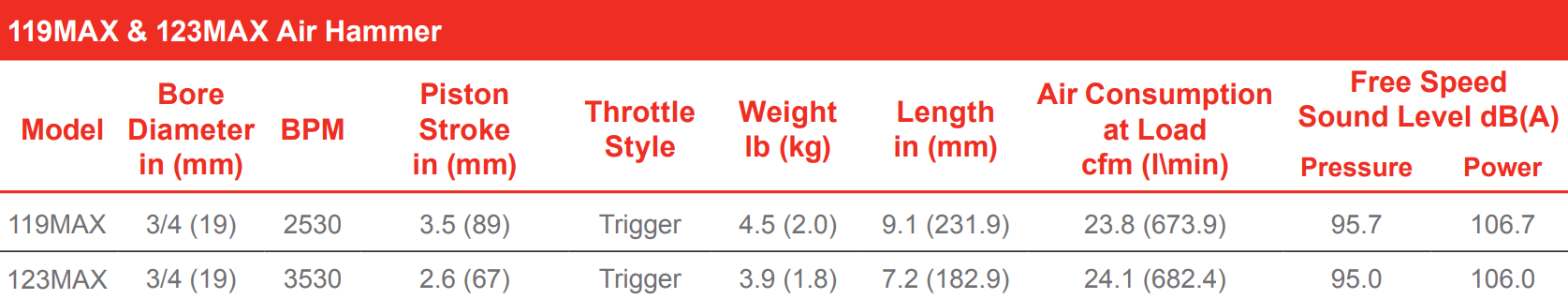 Type: Air Hammer | Bore Diameter (in.): 3/4 | Blows Per Minute (BPM): 3530 | Piston Stroke (in.): 2.6 | Throttle Style: Trigger | Length (in.): 7.2 | Air Consumption @ Load (CFM): 24.1