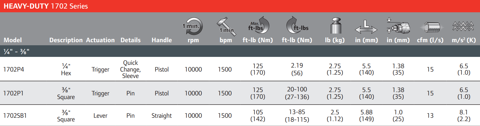 Ingersoll Rand 1702P4 Heavy-Duty Impact Wrench, featuring both trigger and lever actuation, this impact wrench is available in both pistol and D-handle configurations to make it easier for all applications. The 1702 Series Impact Wrenches are powerful and easy to control with a jumbo hammer impact mechanism and power regulation. The 1702 Series Impact Wrenches have a steel hammer case and metal housing ensure a tough, durable tool that will help you breeze through any job without having to worry about your tools giving up. The 1702 Series Impact Wrenches will deliver the same high-quality output every time.
