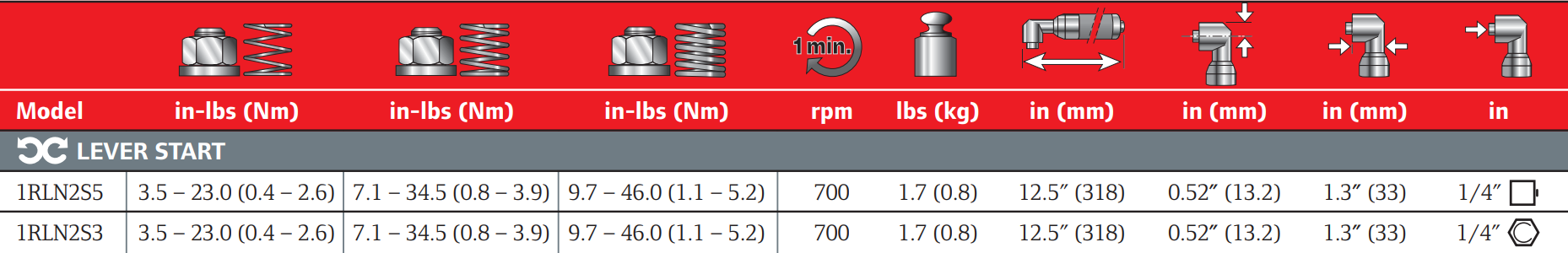 Type: Nutrunner | Actuation: Lever Start | Torque Range (in-lbs): 3.5 - 46.0 | Free Speed (RPM): 700 | Length (in.): 12.5 | Side to Centre (in.): 0.52 | Head Height (in.): 1.3 | Drive Size (in.): 1/4 | Drive Type: Square | Air Inlet Size (in.): 1/8 NPT | Min Hose Size (in.): 1/4 | Air Consumption (CFM): 13