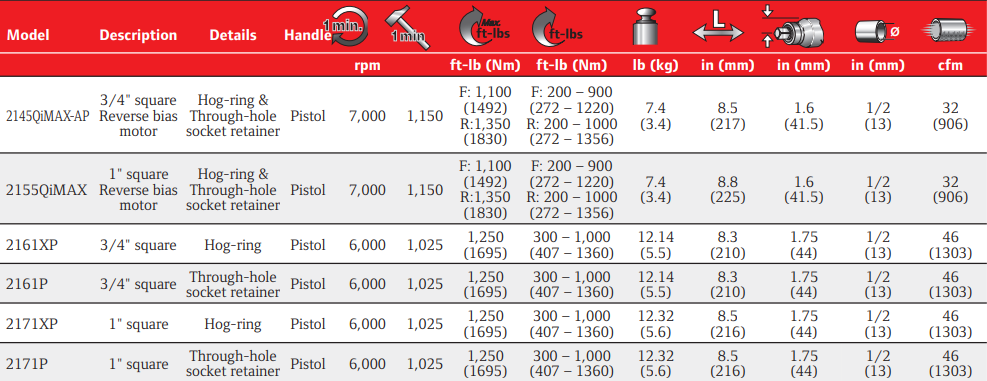 Type: Air Impact Wrench | Configuration: Pistol | Actuation: Trigger | Drive Size (in.): 3/4 | Drive Type: Square | Max Torque (ft-lbs): 1250 | Free Speed (RPM): 6000 | Blows Per Minute (BPM): 1025 | Length (in.): 14.5 | Air Inlet (in.): 3/8 | Min Hose Size (in.): 1/2 | Average Air Consumption (CFM): 10