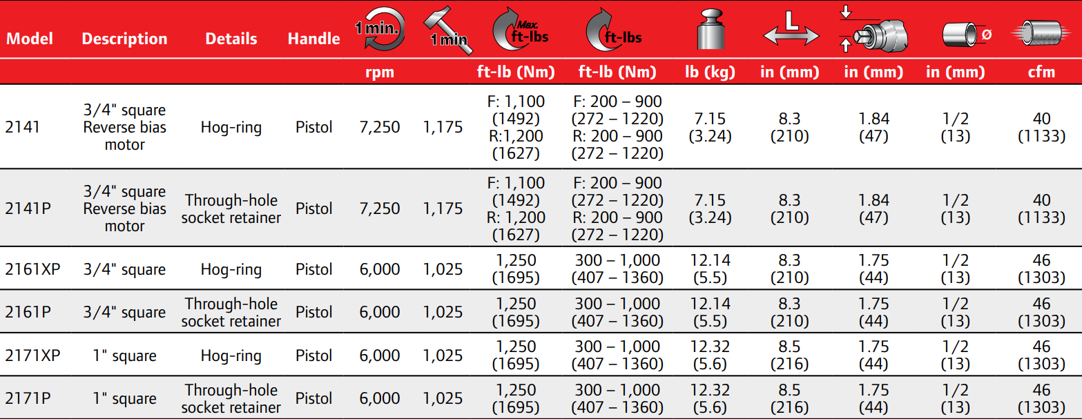 Type: Impact Wrench | Handle: Pistol Grip | Actuation: Trigger | Drive Size (in.): 1 | Drive Type: Square | Anvil Type: Standard | Free Speed (RPM): 6000 | Blows Per Minute (BPM): 1025 | Max Torque (ft-lbs): 1250 | Air Consumption (CFM): 46 | Air Inlet (in.): 3/8 NPT | Min Hose Size (in.): 1/2