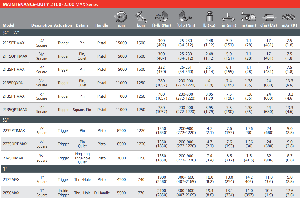 Type: Air Impact Wrench | Configuration: Pistol | Actuation: Trigger | Drive Size (in.): 1 | Drive Type: Pistol Handle | Max Reverse Torque (ft-lbs): 1900 | Free Speed (RPM): 4500 | Blows Per Minute (BPM): 740 | Sound Level (dbA): 94.9 / 105.9 | Length (in.): 10 | Air Inlet (in.): 1/2 | Min Hose Size (in.): 3/4 | Average Air Consumption (CFM): 14.2