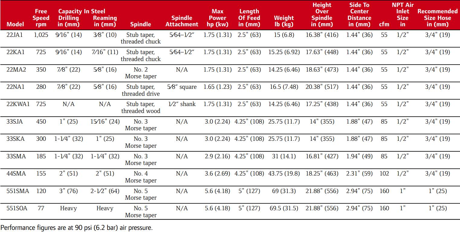 Type: Drill | Drilling Capacity (in.): 9/16 | Spindle: Stub Taper, Threaded Chuck | Spindle Attachment (in.): 5/64 - 1/2 | Max Power (hp): 1.75 | Length of Feed (in.): 2.5 | Height Over Spindle (in.): 16.38 | Side to Center (in.): 1.44 | Air Consumption (CFM): 55 | Air Inlet Size (in.): 1/2 NPT | Recom. Hose Size (in.): 3/4 | Free Speed (RPM): 1025