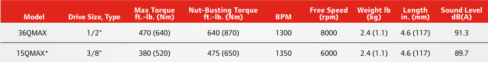 Type: Air Impact Wrench | Configuration: Pistol | Actuation: Trigger | Drive Size (in.): 1/2 | Drive Type: Rear Handle | Nut Busting Torque (ft-lbs): 640 | Max Torque (ft-lbs): 470 | Forward Torque (ft-lbs): 380 | Blows Per Minute (BPM): 1300 | Free Speed (RPM): 8000 | Length (in.): 4.6 | Min Hose Size (in.): 3/8 | Air Consumption @ Load (CFM): 19 | Average Air Consumption (CFM): 24