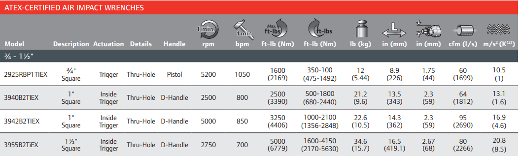 Ingersoll Rand 3940B2TIEX is custom designed to meet ATEX Zone 1 or Zone 2 requirements, with titanium hammer case, bronze end plates, and a corrosion preventative treatment up to 2,500 ft-lbs, which makes it great for outdoor conditions. These tools carry ATEX Ex h IIA T6 Gb X and ISO 80079-36 certification rating. This impact wrench is optimized for general industrial use, MRO, rail, heavy machinery, and shipbuilding. The 3900 Series delivers a high torque output, making every job a breeze. Twin hammer mechanism ensure consistent power and balance while the reverse bias motor helps to remove the most stubborn bolts. Pressure-fed mechanism lubrication ensures complete coverage throughout the tool.