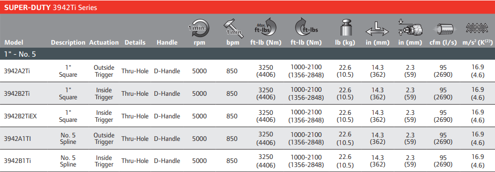 Ingersoll Rand 3942A2Ti Super-Duty Impact Wrench features titanium hammercase, bronze end plates and torque up to 3,250 ft-lbs. The 3900 Series are the premier industrial grade impact wrenches. This impact wrench is optimized for general industrial use, MRO, rail, heavy machinery, and shipbuilding. The 3900 Series delivers a high torque output, making every job a breeze. Twin hammer mechanism ensure consistent power and balance while the Reverse bias motor to help remove the most stubborn bolts. Pressure-fed mechanism lubrication ensures complete coverage throughout the the tool.