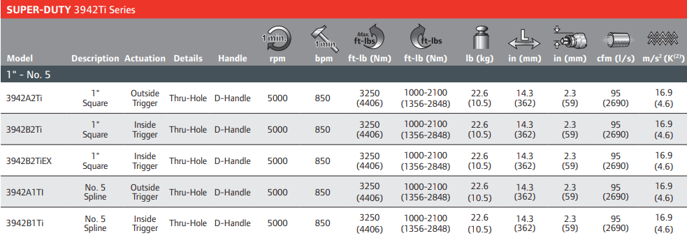 Type: Air Impact Wrench | Configuration: D-Handle | Actuation: Inside Trigger | Drive Size (in.): No. 5 | Drive Type: Spline, Thru-Hole | Max Torque (ft-lbs): 3250 | Free Speed (RPM): 5000 | Blows Per Minute (BPM): 850 | Length (in.): 14.3 | Air Inlet (in.): 1/2 | Min Hose Size (in.): 3/4 | Average Air Consumption (CFM): 95