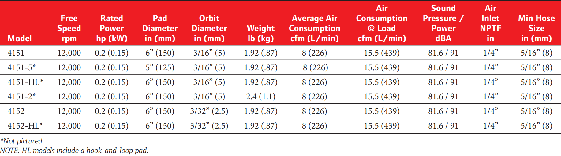 Type: Orbital Sander | Rated Power (HP): 0.2 | Free Speed (RPM): 12000 | Exhaust: Rear | Pad Diameter (in.): 6 | Orbit Diameter (in.): 3/16 | Average Air Consumption (CFM): 8 | Air Consumption @ Load (CFM): 15.5 | Min Hose Size (in.): 5/16 | Air Inlet Size (in.): 1/4 NPTF