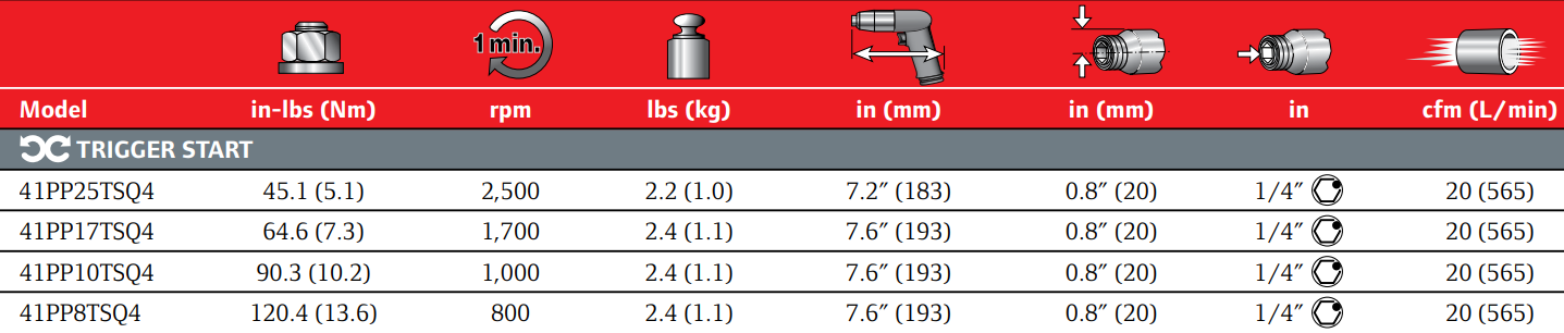 Ingersoll Rand 41PP25TSQ4 Pistol Grip Air Screwdriver features a Positive Jaw Clutch design which is great for any fastening applications involving plastics, composites and metals that require precise torque control. This air screwdriver has an ergonomic shape, modular designs, is well-balanced and lightweight and has an egg-shaped housing designed for a natural fit and maximum operator comfort. Ingersoll Rand 41PP25TSQ4 Pistol Grip Air Pneumatic Screwdriver is accurate, fast and reliable. This tool has a one-handed reverse lever and is highly recommended for applications where precise torque control is required. Please note that this is an air-powered hand tool, all pneumatic tools are powered by compressed air supplied by an air compressor.