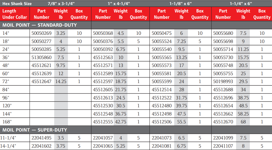 Type: Moil Point | Under Collar Length (in.): 48 | Hex Shank (in.): 7/8 x 3 - 1/4 | Material: Steel