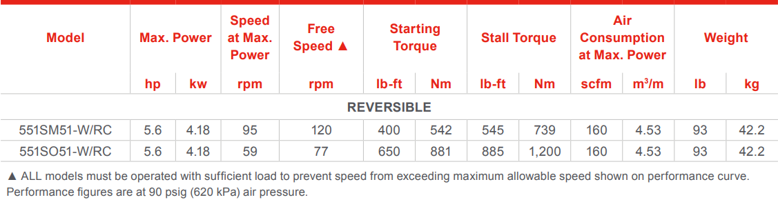 Type: Air Motor | Max Power (HP): 5.6 | Max Power (kw): 4.18 | Speed @ Max Power (RPM): 59 | Free Speed (RPM): 77 | Starting Torque (lb-ft): 650 | Starting Torque (Nm): 881 | Stall Torque (lb-ft): 885 | Stall Torque (Nm): 1,200 | Air Consumption @ Max Power (SCFM): 160 | Air Consumption @ Max Power (m³/m): 4.53