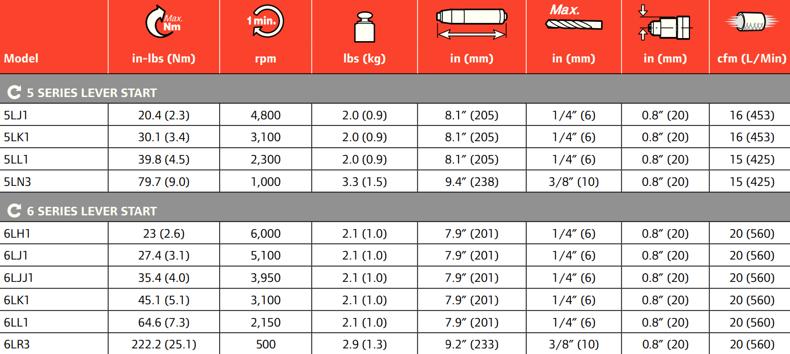 Type: Inline Drill | Power (HP): 0.51 | Actuation: Lever Start | Max Torque (in-lbs): 222.2 | Free Speed (RPM): 500 | Length (in.): 9.2 | Bit Holder Capacity (in.): 3/8 | Side to Center (in.): 0.8 | Air Consumption (CFM): 20 | Air Inlet Size (in.): 1/4 NPT