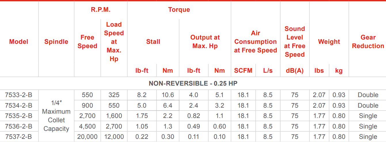 Type: Milling Motor | Power (HP): 0.25 | Spindle Max Collet Capacity (in.): 1/4 | Free Speed (RPM): 4500 | Load Speed @ Max HP (RPM): 2700 | Stall Torque (ft-lbs): 1.05 | Stall Torque (Nm): 1.3 | Torque Output @ Max HP (ft-lbs): 0.49 | Torque Output @ Max HP (Nm): 0.60 | Air Consumption @ Free Speed (SCFM): 18.1 | Sound Level @ Free Speed dB(A): 75 | Gear Reduction: Single
