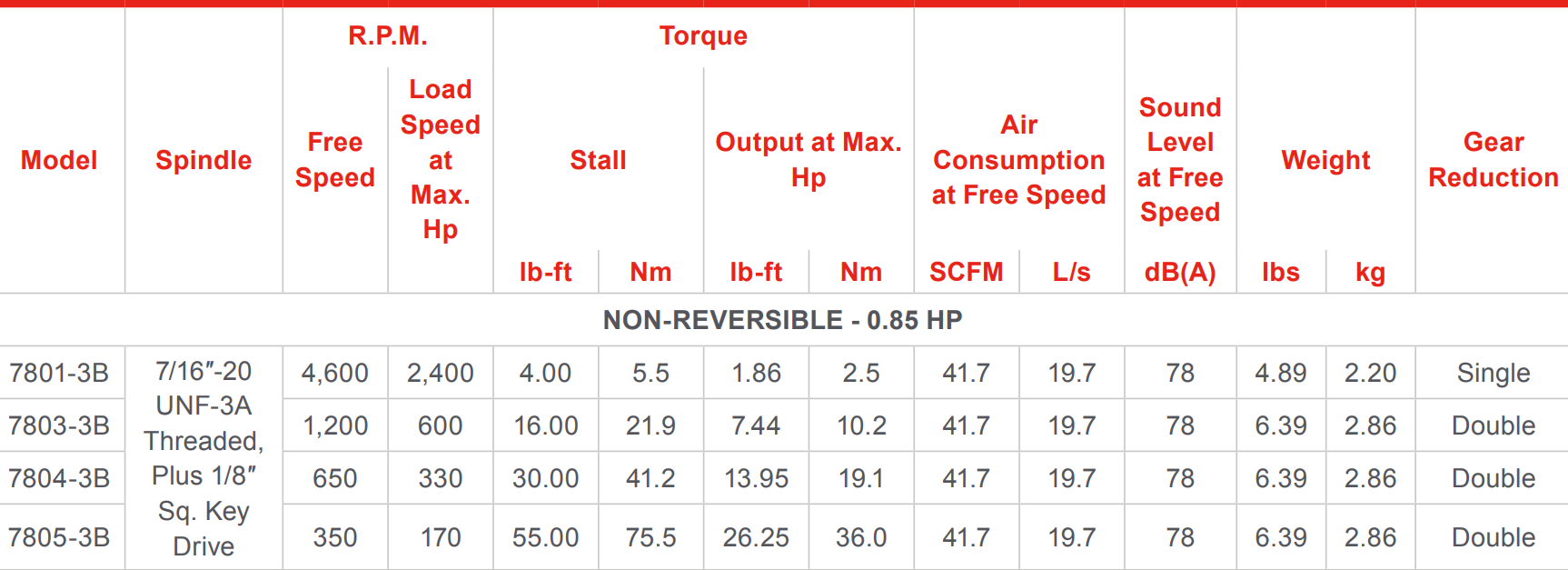 Type: Milling Motor | Power (HP): 0.85 | Spindle Threaded (in.): 7/16 - 20 UNF-3A | Plus Square Key Drive (in.): 1/8 | Free Speed (RPM): 4600 | Load Speed @ Max HP (RPM): 2400 | Stall Torque (ft-lbs): 4.00 | Stall Torque (Nm): 5.5 | Torque Output @ Max HP (ft-lbs): 1.86 | Torque Output @ Max HP (Nm): 2.5 | Air Consumption @ Free Speed (SCFM): 41.7 | Sound Level @ Free Speed dB(A): 78 | Gear Reduction: Single