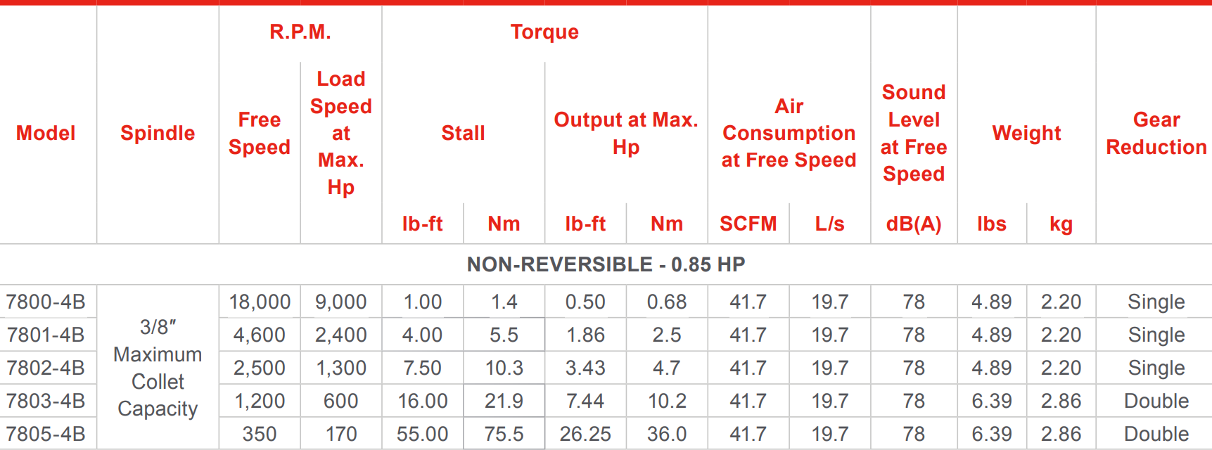 Type: Milling Motor | Power (HP): 0.85 | Spindle Max Collet Capacity (in.): 3/8 | Free Speed (RPM): 4600 | Load Speed @ Max HP (RPM): 2400 | Stall Torque (ft-lbs): 4.00 | Stall Torque (Nm): 5.5 | Torque Output @ Max HP (ft-lbs): 1.86 | Torque Output @ Max HP (Nm): 2.5 | Air Consumption @ Free Speed (SCFM): 41.7 | Sound Level @ Free Speed dB(A): 78 | Gear Reduction: Single