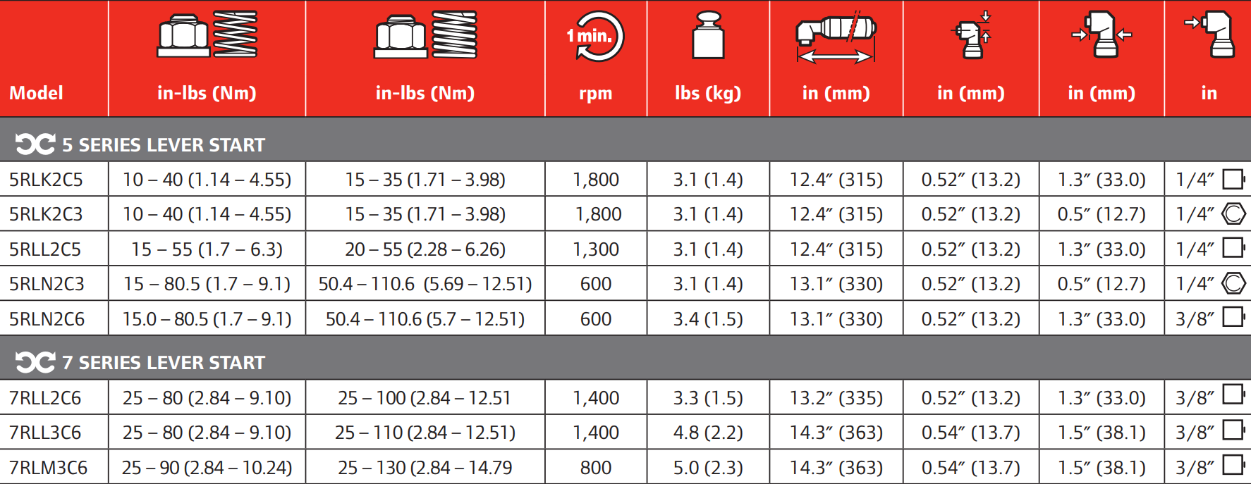 Type: Nutrunner | Torque Range (in-lbs): 25 - 100 | Torque Range (Nm): 2.84 - 12.51 | Free Speed (RPM): 1,400 | Length (in.): 13.2 | Side to Center (in.): 0.52 | Head Height (in.): 1.3 | Drive Size (in.): 3/8 | Drive Type: Square | Air Inlet Size (in.): 1/4 NPT | Min Hose Size (in.): 5/16 | Air Consumption (CFM): 27