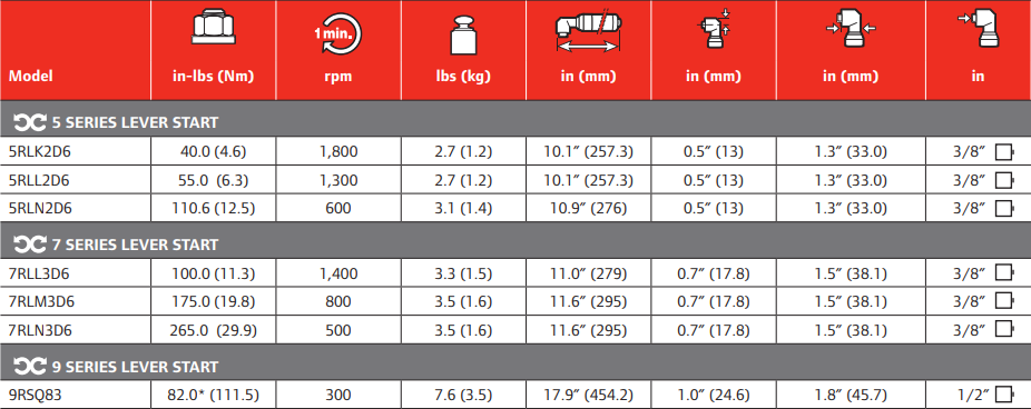 Type: Nutrunner | Actuation: Lever Start | Torque Range (in-lbs): 265.0 | Free Speed (RPM): 500 | Length (in.): 11.6 | Side to Center (in.): 0.7 | Drive Size (in.): 3/8 | Drive Type: Square | Air Consumption (CFM): 27 | Air Inlet NPT (in.): 1/4 | Sound Level (dbA): 79