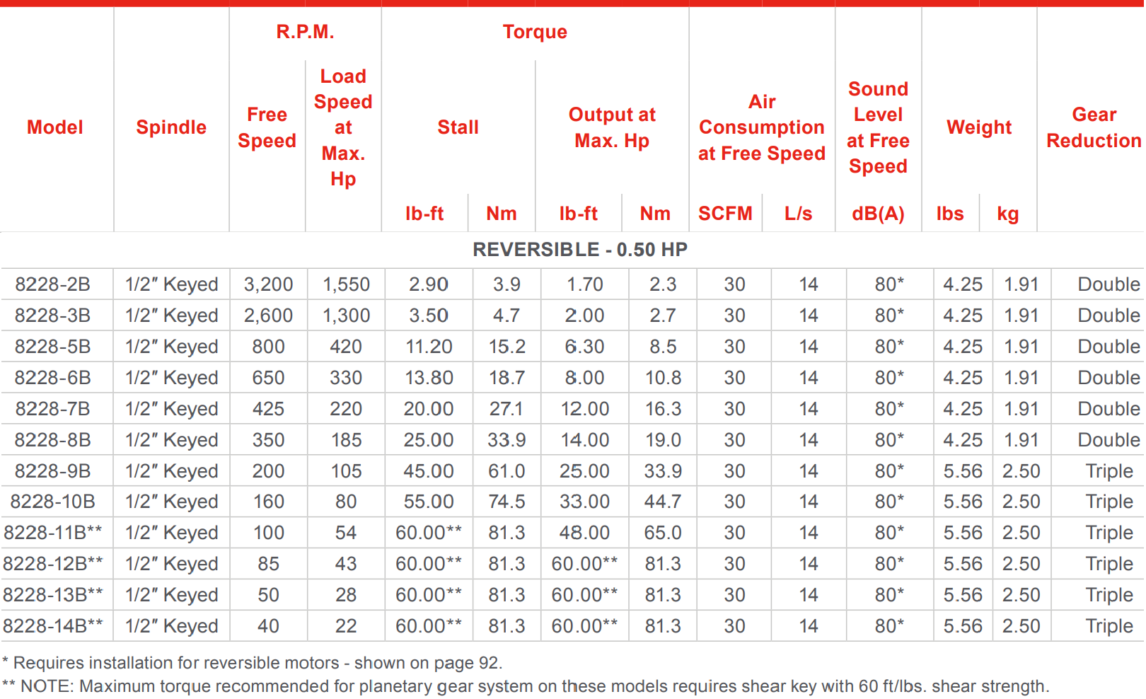 Type: Power Motor | Spindle Keyed (in.): 1/2 | Free Speed (RPM): 2600 | Load Speed @ Max HP (RPM): 1300 | Stall Torque (ft-lbs): 3.50 | Stall Torque (Nm): 4.7 | Torque Output @ Max HP (ft-lbs): 2.00 | Torque Output @ Max HP (Nm): 2.7 | Air Consumption @ Free Speed (SCFM): 30 | Sound Level @ Free Speed dB(A): 80 | Gear Reduction: Double
