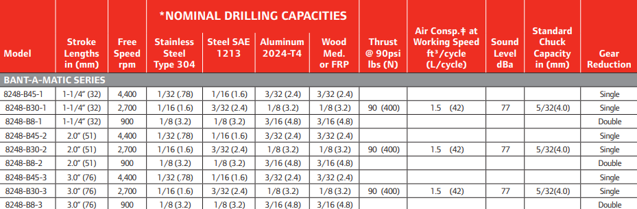 Type: Feed Drill | Capacity (in.): 1/8 | Power (HP): .25 | Stroke Length (in.): 1-1/4 | Free Speed (RPM): 4,400 | Gear Reduction: Single | Air Inlet Size (in.): 1/8 NPT Male | Recommended Hose Size ID (in.): 1/4